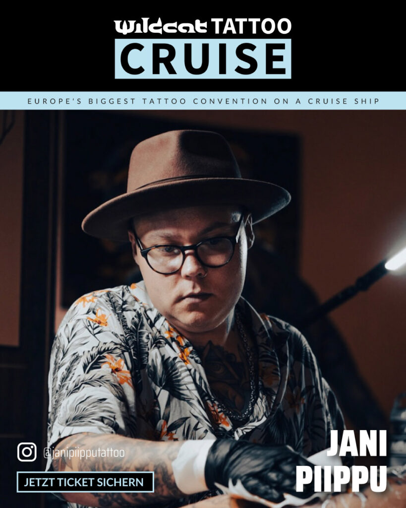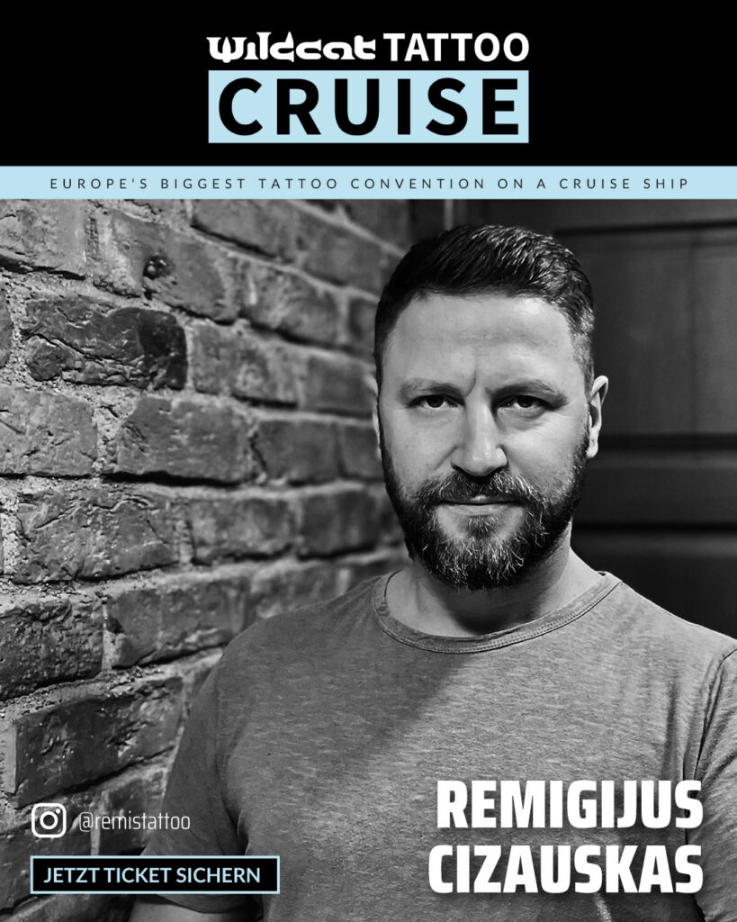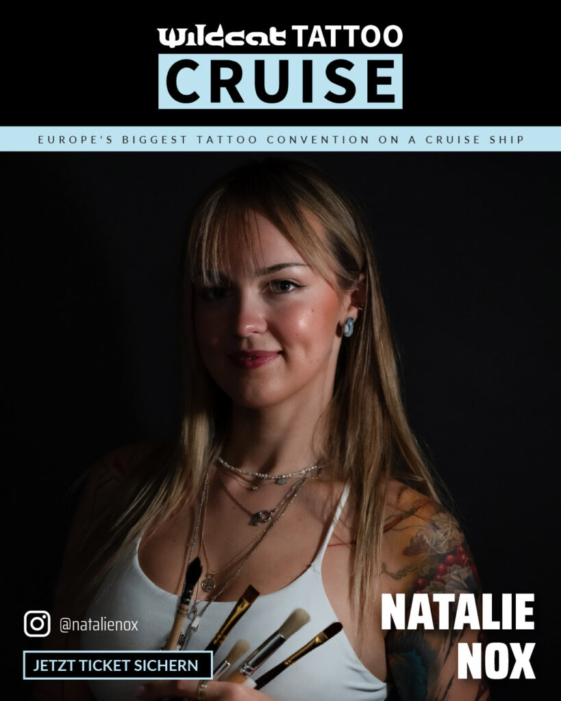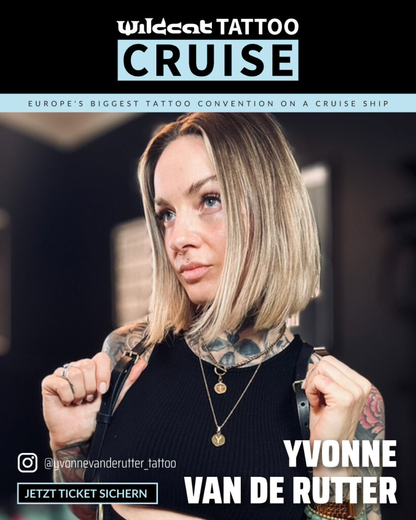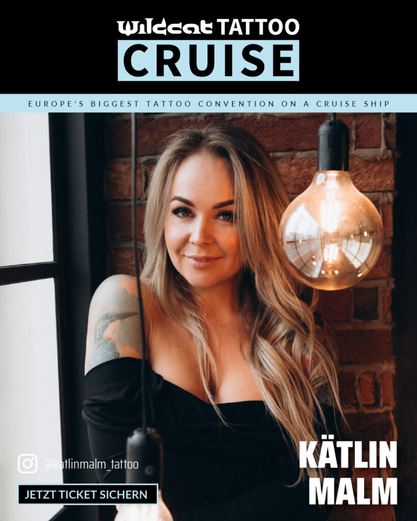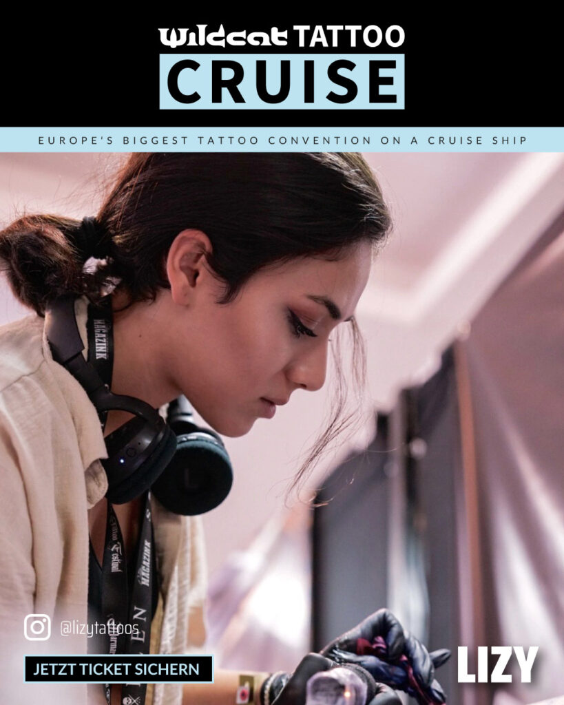 Lizy's work impresses with its remarkable precision and depth. She comes from Finland and brings her distinctive style aboard the Wildcat TattooCruise 2026.