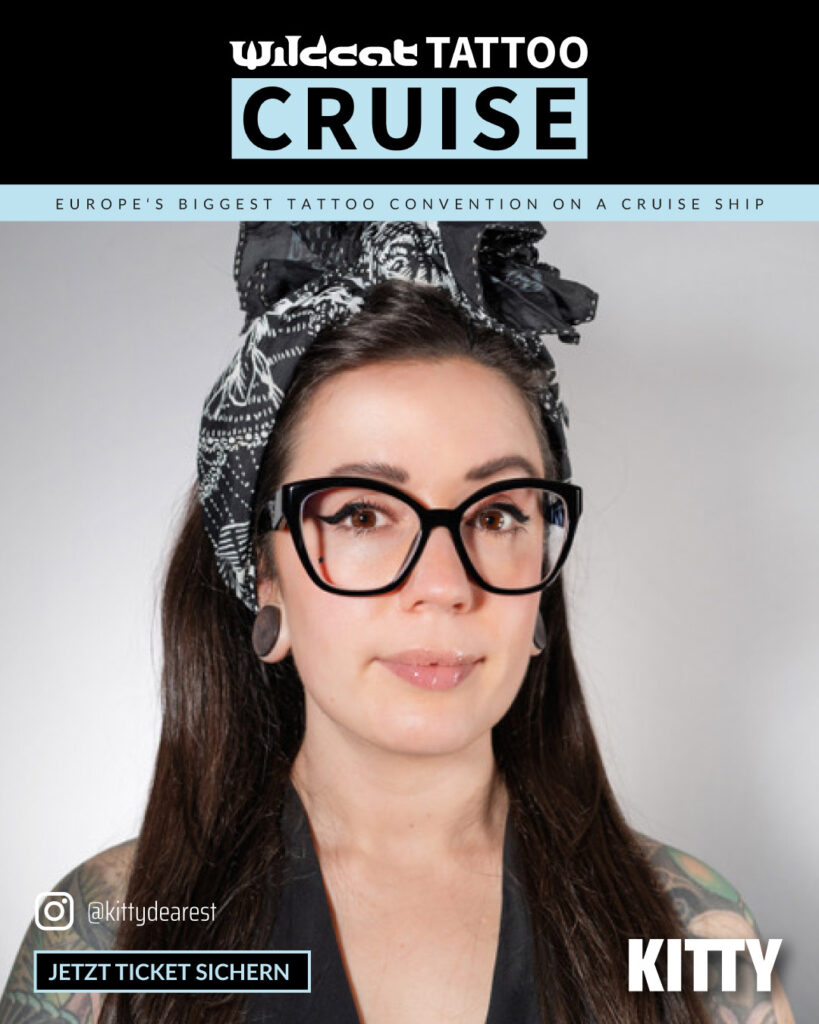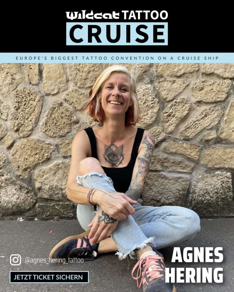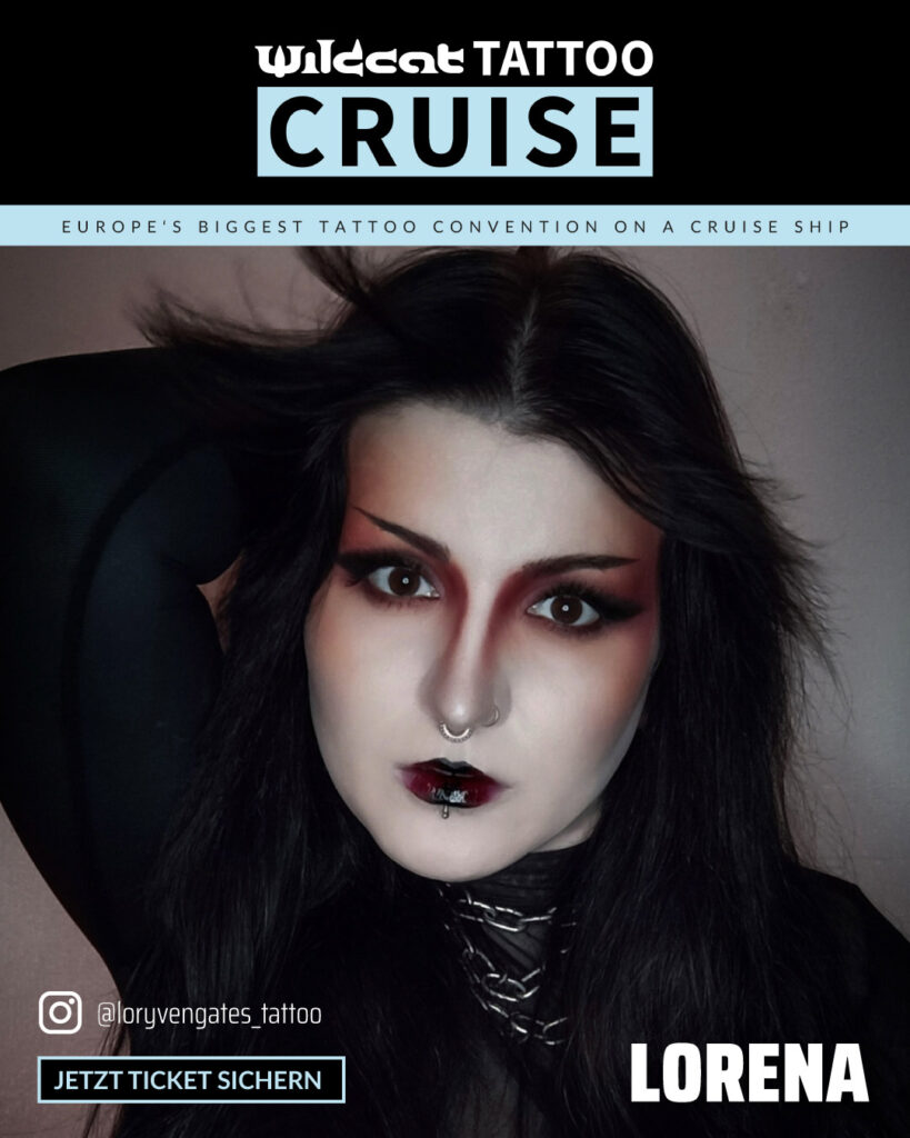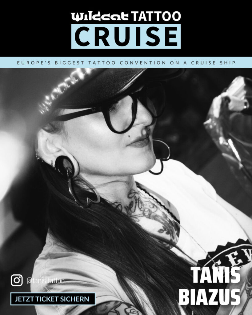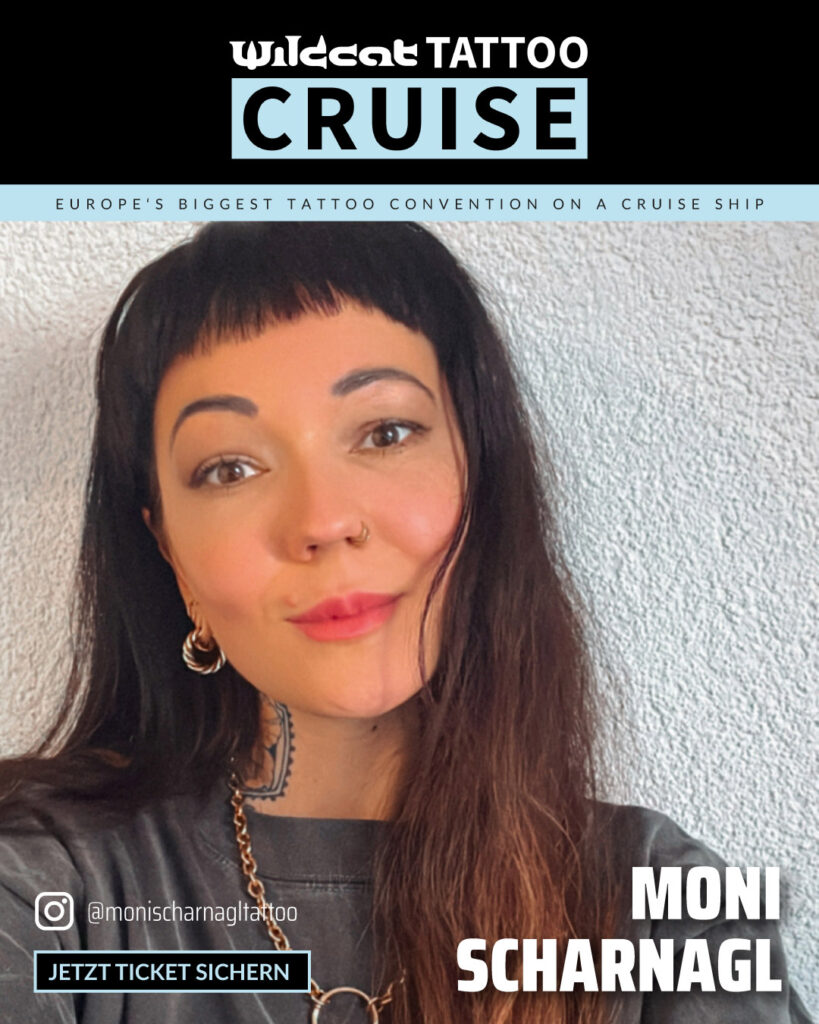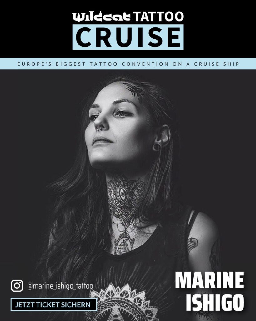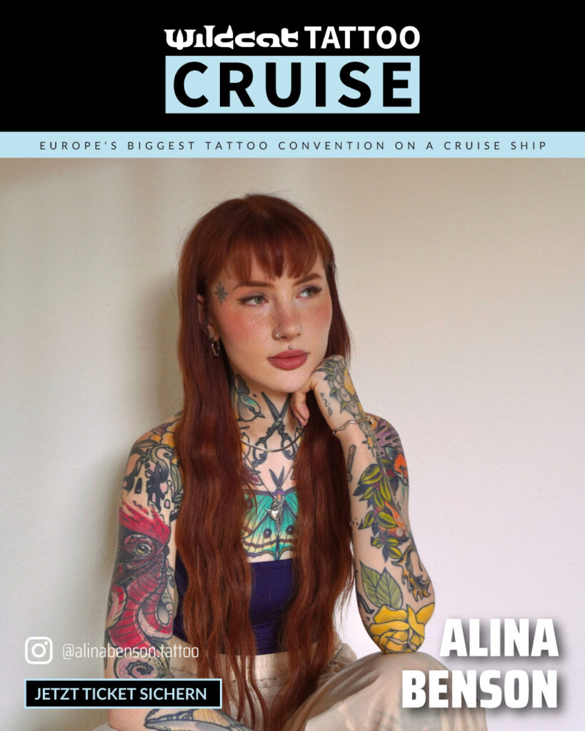 Lizy's work impresses with its remarkable precision and depth. She comes from Finland and brings her distinctive style aboard the Wildcat TattooCruise 2026.