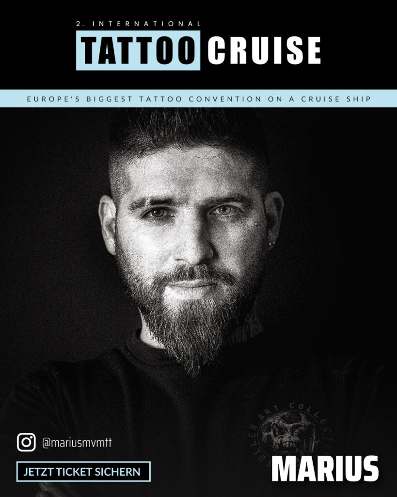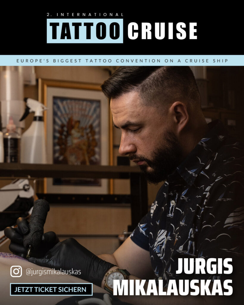 At TattooCruise 2026, he looks forward to presenting his work, making new contacts, and sharing inspiration with other artists.
